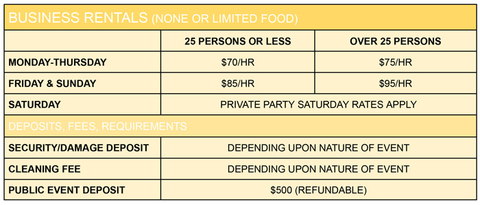 EXCLUSIONS: Rates not available for any Saturday rentals. See Private Rental Rates for Saturday rental pricing.